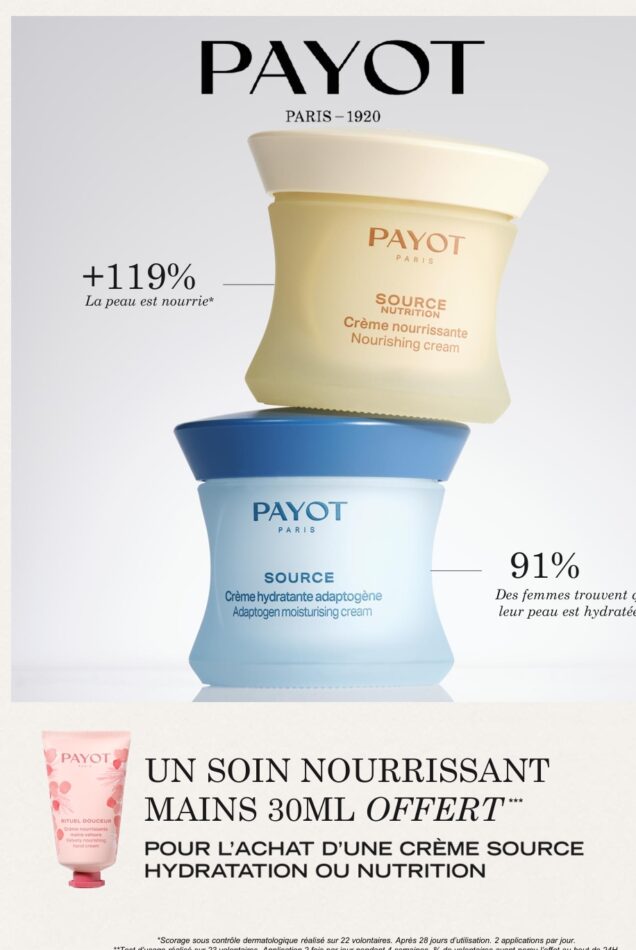 À Piriac sur Mer, Anne Esthétique met la douceur à l’honneur avec Payot. En ce moment, profitez de Creme main en cadeau. En effet, l’offre Une crème main Payot offerte pour l’achat de votre crème source accompagne votre routine visage. Ainsi, vous prolongez à la maison les résultats obtenus en institut, tout en gardant une peau confortable au quotidien. De plus, ce duo reste simple et agréable à utiliser.